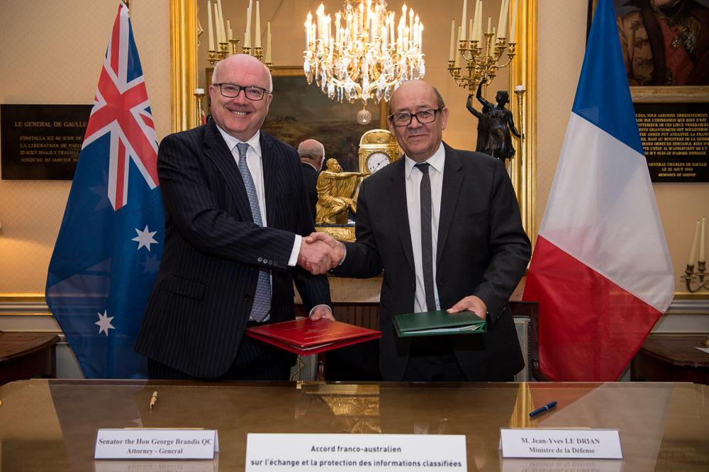 The cooperation between Australia and France is progressing. Mr. George Brandis and Mr. Jean-Yves Le Drian signed a bilateral agreement on the sharing of classified information. This agreement represents an important step in the development of the strategic partnership between Australia and France.